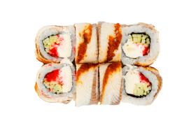 650 г - осось, рис, кунжут, cоус унаги, вугор, авокадо, ікра, креветка, морський гребінець, соус шрірача, японський
