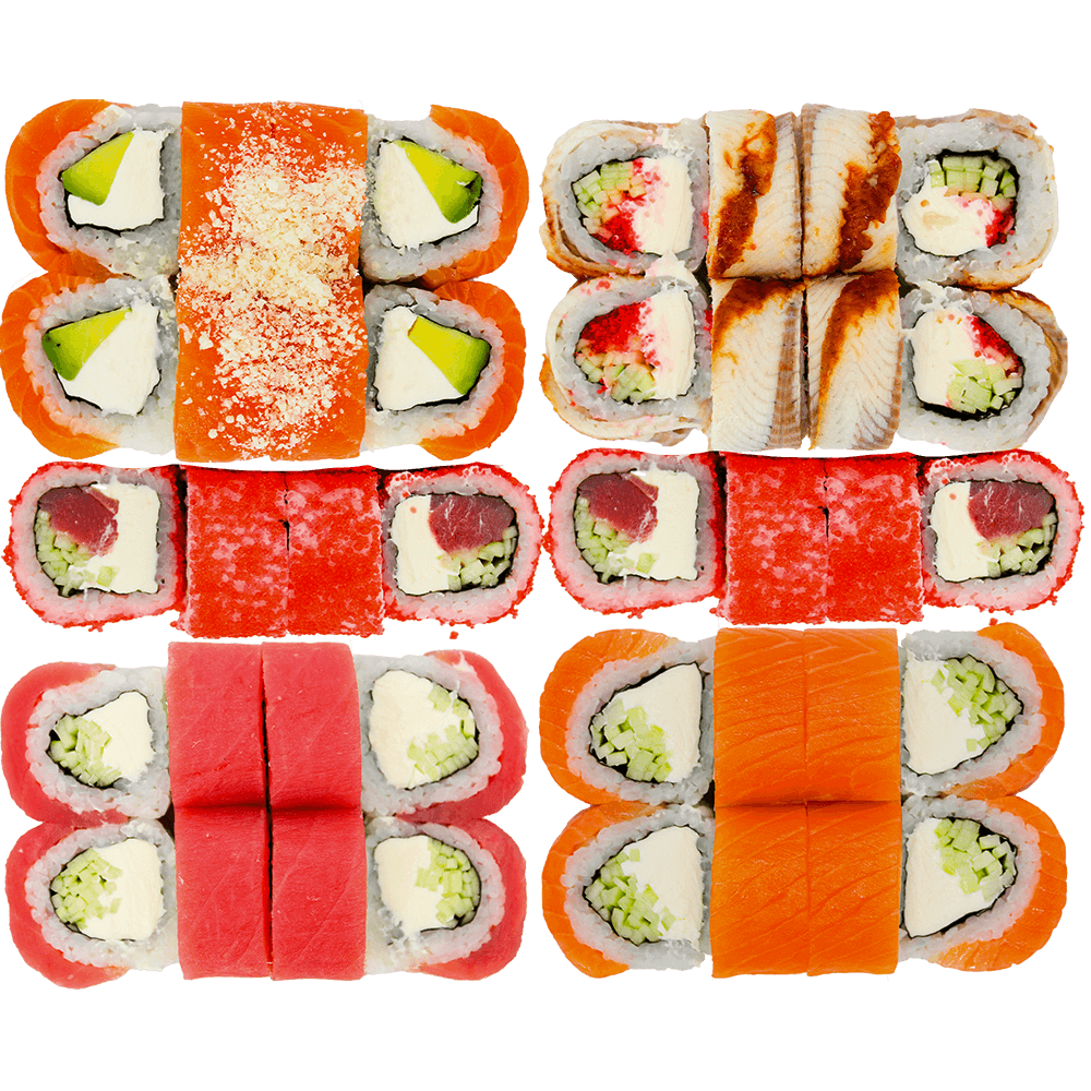 Філадельфія з лососем; Філадельфія з тунцем; Філадельфія з вугрем; Філадельфія з лососем та пармезаном; Філадельфія з тунцем в тобіко.